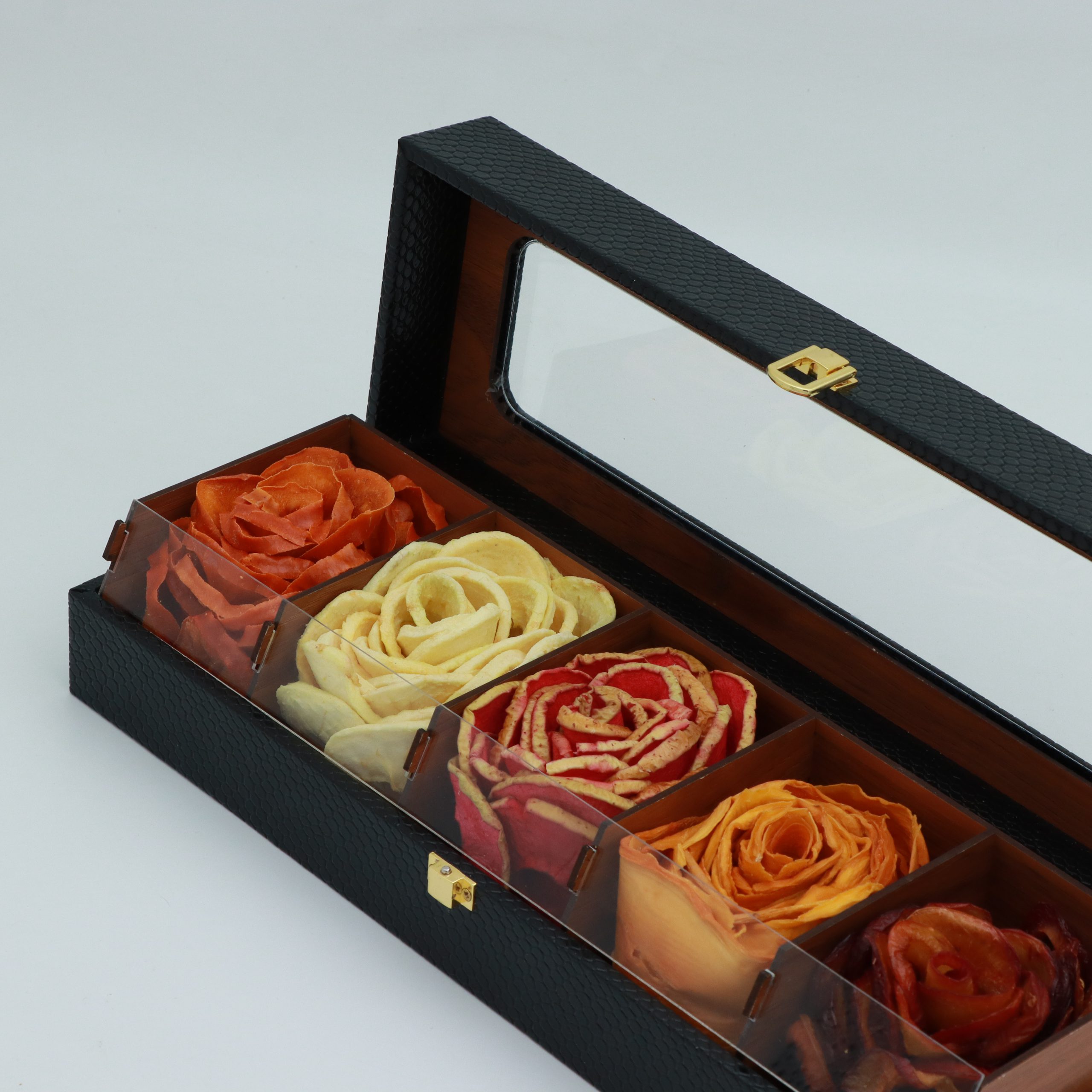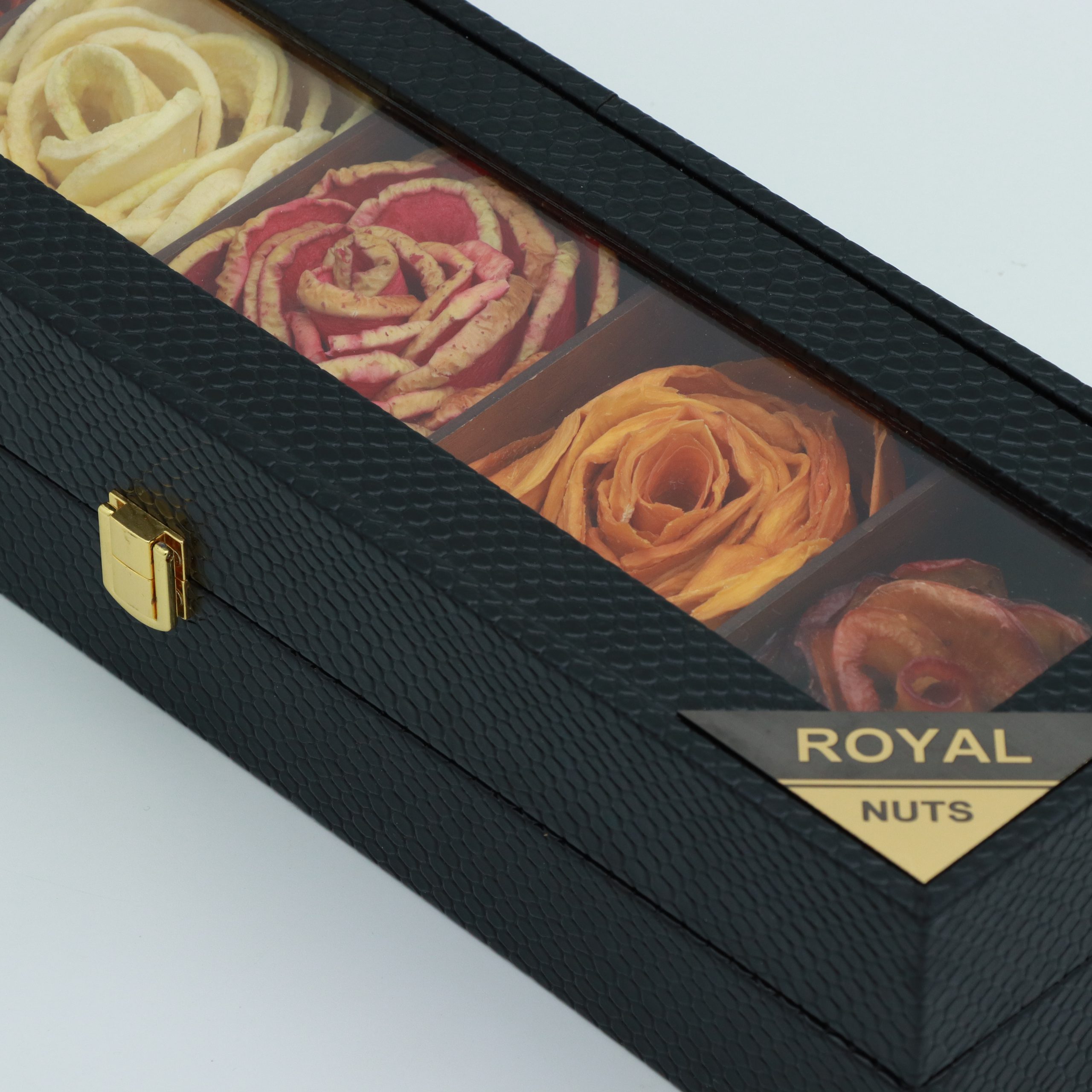 یک جعبه لوکس کادویی شامل برگه میوه خشک تزئین شده به شکل گل رز