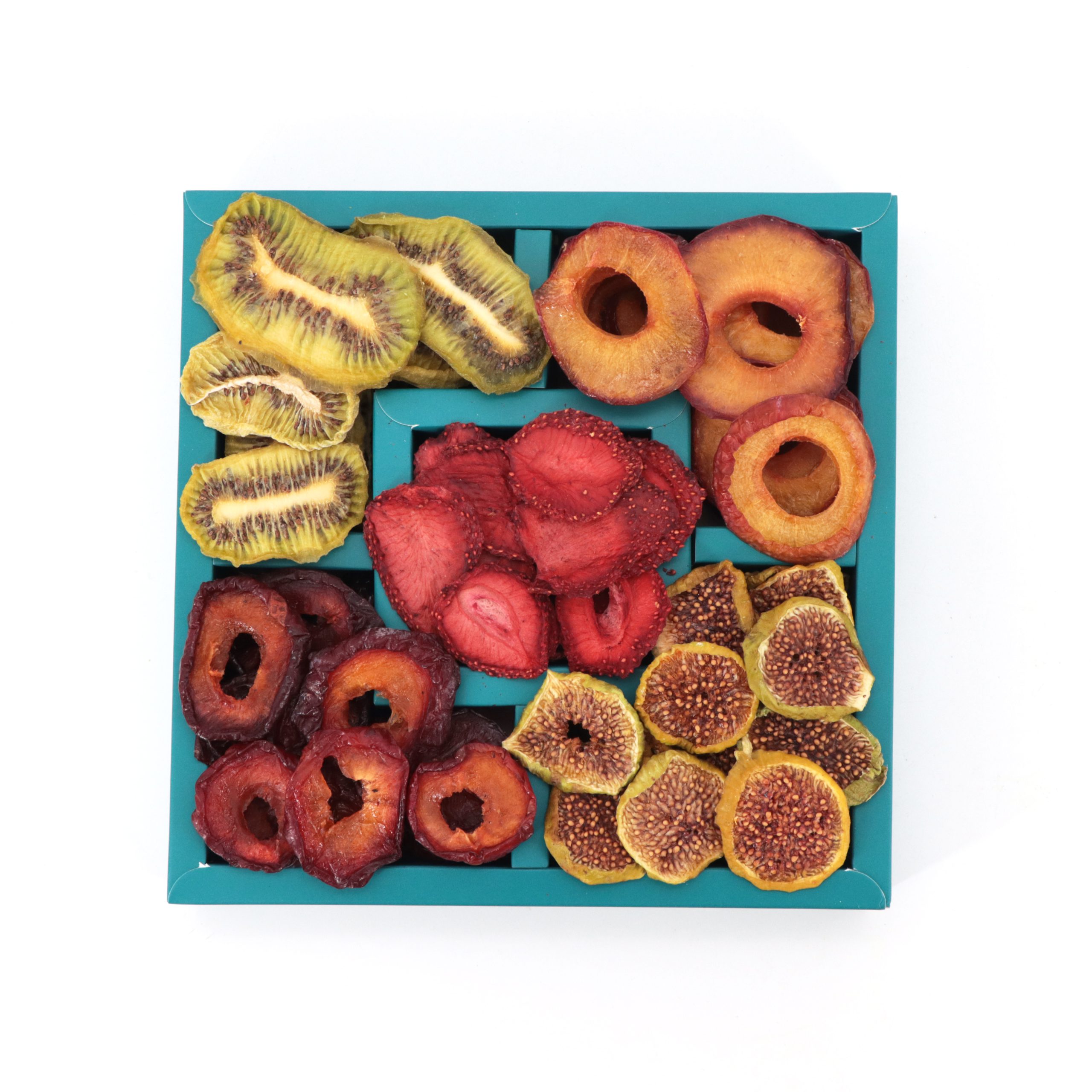 انجیر اسلایس 100 گرم , برگه آلو جنگلی 100 گرم , آلو شابلون 80 گرم , کیوی 60 گرم , توت فرنگی 50 گرم